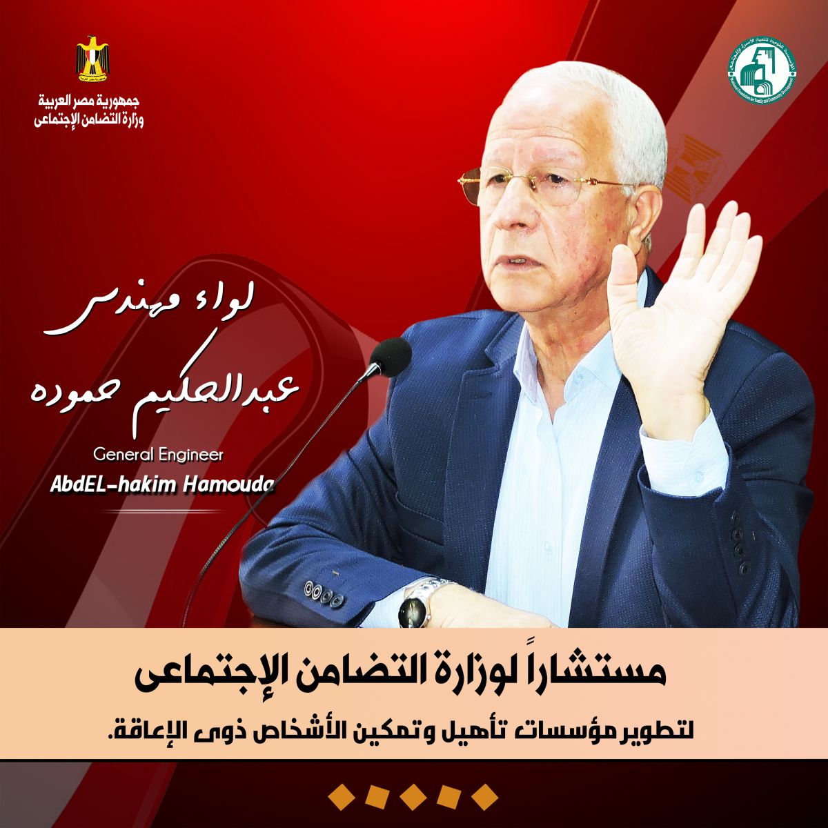 بالترقية الجديدة مستشاراً لوزارة التضامن الإجتماعى لتطوير مؤسسات تأهيل وتمكين الأشخاص ذوى الإعاقة .