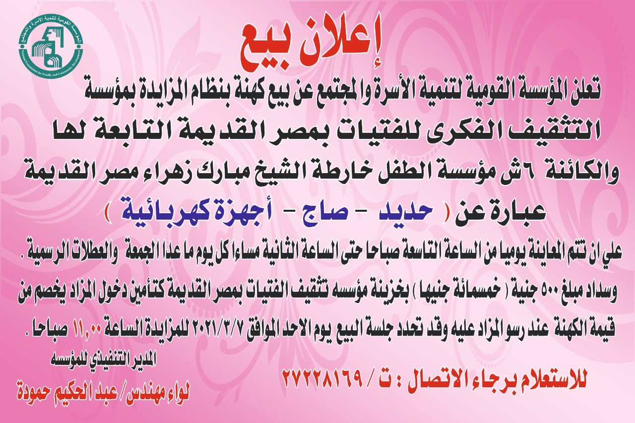>>>>>>>>>>>>>>> إعلان بيع <<<<<<<<<<<<<< تعلن المؤسسة القومية لتنمية الأسرة والمجتمع عن بيع كهنه بنظام المزايدة بمؤسسة التثقيف الفكرى للفتيات بمصر القديمة التابعة لها والكائنة 6 شارع مؤسسة الطفل - خارطة الشيخ مباركـ - زهراء - مصر القديمة . على أن تتم المعاينة يومياً من الساعة التاسعة صباحاً حتى الساعة الثانية ظهراً كل يوم ماعدا الجمعة والعطلات الرسمية . وسداد مبلغ 500 جنيهاً (خمسمائة جنيهاً) بخزينة مؤسسة تثقيف الفتيات بمصر القديمة كتأمين دخول المزاد يخصم من قيمة الكهنة عند رسو المزاد عليه وقد تحدد جلسة البيع يوم الأحد الموافق 7-3-2021 للمزايدة الساعة 11.00 صباحاً .