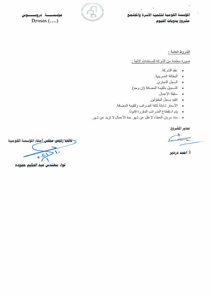 وذلك طبقا لكراسة الشروط والمواصفات المحددة بكراسة المناقصة وتسحب الكراسة مجانا من مقر المؤسسة القومية لتنمية الأسرة والمجتمع بالعنوان 3 ش حافظ حسن - العجوزة خلال الفترة من 13/1/2021 وحتى 27/1/2021 وتعقد جلسة فتح المظاريف يوم الاحد 31/1/2021 الساعة الثانية عشر ظهرا بمقر المؤسسة ولا تقبل اي عطاءات بعد هذا التوقيت .