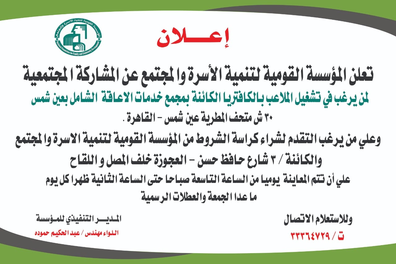 >>>>>>>>>>>>>> إعلان <<<<<<<<<<<<<< تعلن المؤسسة القومية لتنمية الأسرة والمجتمع عن المشاركة المجتمعية لمن يرغب في تشغيل الملاعب بالكافتريا الكائنة بمجمع خدمات الإعاقة الشامل بعين شمس 30 شارع متحف المطرية - عين شمس - القاهرة . وعلى من يرغب التقدم لشراء كراسة الشروط من لمؤسسة القومية لتنمية الأسرة والمجتمع والكائنة " 3 - شارع حافظ حسن - العجوزة - خلف معمل المصل واللقاح " على أن تتم المعاينة يومياً من الساعة التاسعة صباحاً حتى الساعة الثانية ظهراً كل يوم ماعدا الجمعة والعطلات الرسمية . ولللإستعلام الأتصال على رقم / 33364729 آخر ميعاد لشراء الكراسة وتلقى العروض هو 3/22الساعة العاشره صباحا جلسة فتح العطاءات وإجراء المزايده لواء مهندس / عبدالحكيم حمودة نائب رئيس مجلس الأمناء .. والمدير التنفيذى للمؤسسة القومية لتنمية الأسرة والمجتمع .